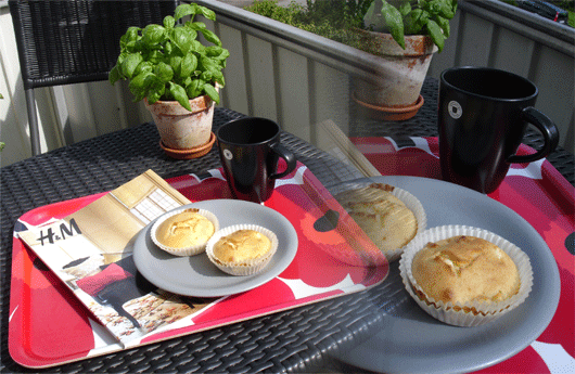 Känns som lugnet före stormen… idag är det dagen före Dagen med stort D och det laddas och planeras inför morgondagen. Imorgon startar Formex och väldigt många inredningsföretag, designers och inredningsintresserade kommer hänga på låset till mässan. Dagen har dock för mig börjat lugnt med ett bak, har provat två för mig nya recept. Har inte bakat på evigheter. Det blev bland annat Muffins med aprikoser och fetaost som fick följa med ut i solen på balkongen tillsammans med H&M HOME.