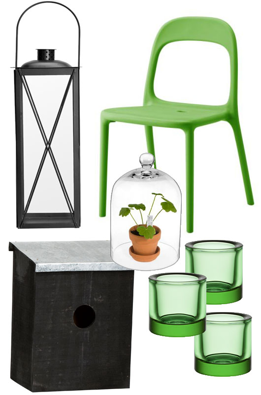 Drivhus Glaskupa från Åhléns. Stolen Urban från IKEA. Iittalas Kivi ljuslyktor. Lykta och fågelbo från Village.