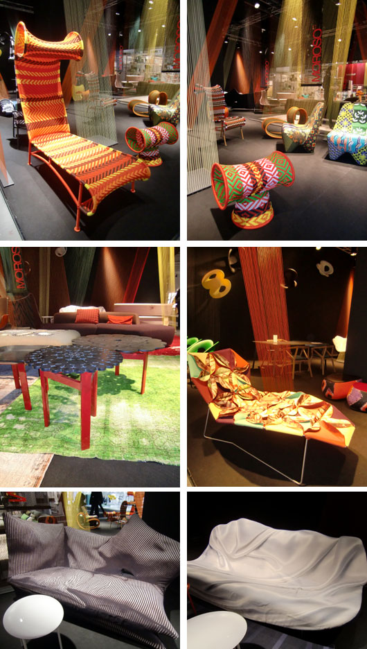 Italienska Moroso´s monter var gigantisk och fylld med galna färger, se bara nedan. Sofforna var väldigt roliga med tyger som gav intrycket av dels en soffa med kuddar och en med ett vitt tyg som såg ut att bara var svept över. Kanske inte syns så bra på fotona men de var väldigt tuffa och den vita soffan var man verkligen tvungen att gå fram och känna på för att inse att det var tyget som gjorde soffans intryck. Kul och färgsprakande monter!