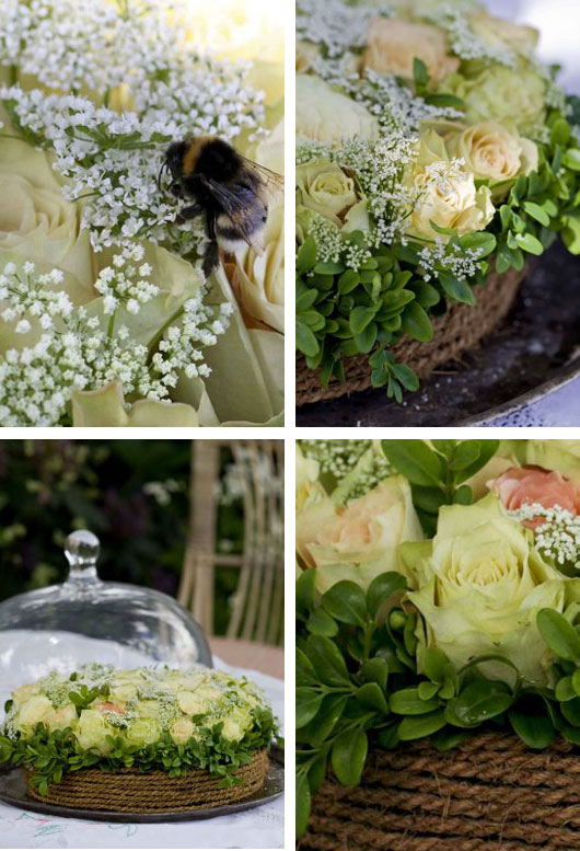 Fotona är lånade av Blomsterverkstad. Kreativa Minna har gjort en prinsesstårta med rosor, kirskålsblommor, buxbom och kokossnöre.