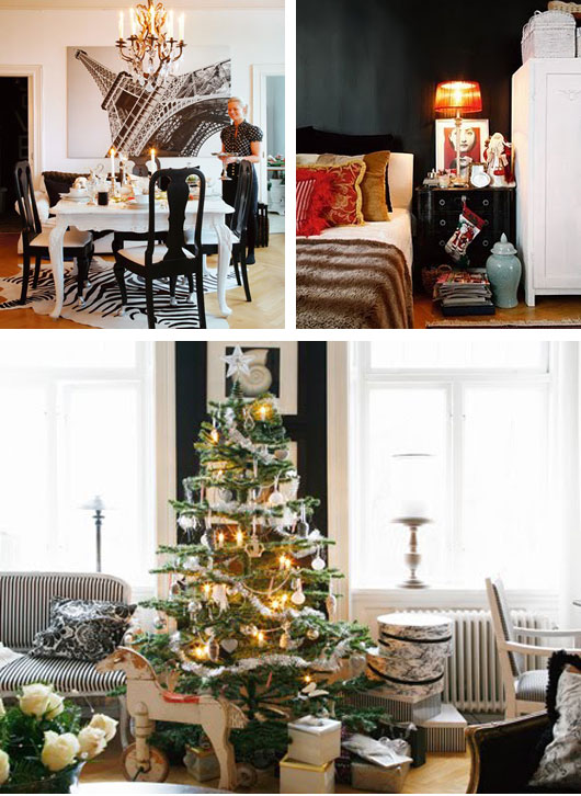 Söta bloggerskan Elizabetth som jag träffat genom FormForum visar nu sin fina lägenhet i senaste numret av Allt i hemmet. Elizabetths stil är så långt ifrån min egen man kan komma och jag tycker den är döläcker! Modig och spännade. Hon har en egen butik i Kungshamn och en verkstad där hon förvandlar 1700-tals möbler till nyproducerade. Just nu visar hon sin julpyntade lägenhet på 65m2 i Skövde som går i svart, guld, silver med egendesignade möbler, fjärdrar, pälsplädar och zebramatta. Jag är mäkta imponerad, det är så mycket av allt, så stort och så jäkla snyggt!