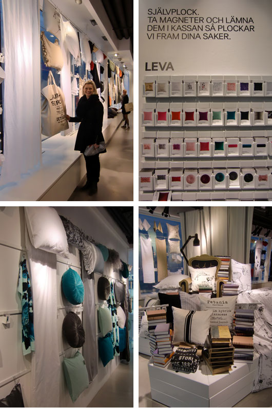 Jag och tjejerna som skriver DesignbyE och NancyandI avlsuta vår helg i Stockholm i måndags med en liten shoppingrunda. Vi gjorde bland annat ett besök hos H&M´s enda fysiska butik med heminredning. Man tar helt enkelt de magneter som syns på fotot och går till kassan med dem och så plockar de fram ens varor. Butiken var snyggt stylad och var var kul att känna och klämma och se proportionerna på de varor som man annars bara ser digital. Det blev dock inga inköp denna gången men det finns ju alltid en webshop om man ändrar sig och då slipper man ju bära på en massa påsar också 😉