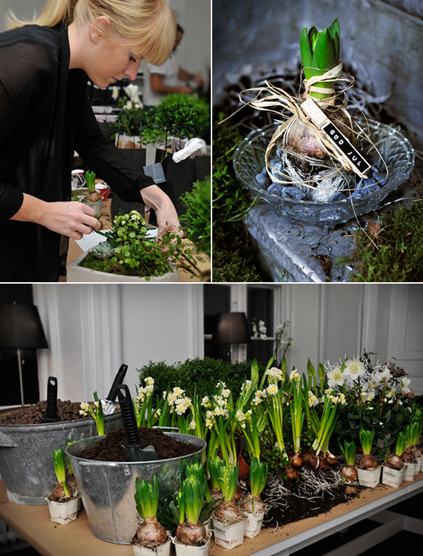En sak vi gjorde som Sarah tipsade om var att ta bort krukan på växten/löken och vira runt grönmossa och så dra en tunn ståltråd runt som en liten ”handgranat”;). Det lilla knytet blir fint att lägga på ett fat eller att sätta i en glas vas/skål. Förutom att julpyssla med blommor och blader fick vi en Trendspaning av Frida och bjöds på glögg, peppisar och skum- tomtar! TACK Frida och Sarah för en rolig kväll!