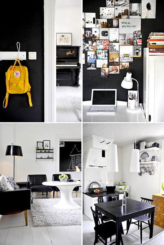 Börjar veckan med inspiration från ett trendigt hem i svart/vitt med några få färgklickar. Hemmet tillhör Johanna från Highwaydesign.nu och dessa foton ger mig en rejäl KICKSTART denna måndagsmorgon + att kollaget ovanför arbets- platsen är något jag absolut kommer lägga på minnet för framtiden.