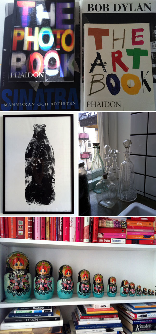 Det har varit en intensiv jobbvecka med två dagar i STHLM för fotning av nästkommande kollektionen som lanseras i augusti. Men vad galet roligt det är att vara med på en fotning och arbeta med fotograf och stylist, vid denna fotningen var stylisten Christina Breeze le Guellaff som arbetar mycket för Family Living. Igår var vi i en superfin lägenhet i Vasastan och de hade så mycket tokroliga och fina saker. Jag passade på att knäppa några foton med iPhonen på detaljer i hemmet som jag tänkte visa här utan att avslöja för mycket från hemmet eller från fotningen. Jag älskar de ryska dockorna och i bokhyllan som de stod i var böckerna färgkordinerade, snyggt och appropå böcker så växte mitt habegär för coffetable books som The Art book och The Photo book, vilka godingar! Nu ska jag strax lägga ihop laptopen och det är dags för fredagsmys med nybakade choklad muffins -mums!