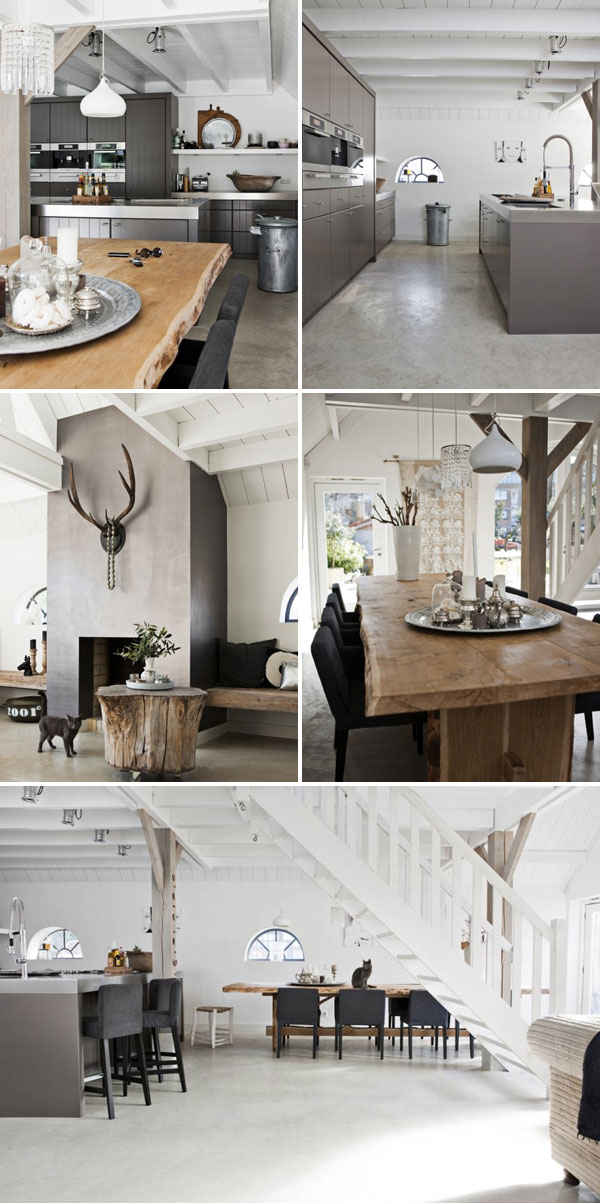 När den gamla bondgården från 1800-talet skulle totalrenoveras så började man med att gjuta ett betonggolv och sedan inreda efter det. Resultatet är en bottenvåning med kök och vardagsrum i-ett med en mix av trä, modern köksinredning och orginella detaljer. Allt i en skön grå/vit avskalad harmoni. Väldigt modigt att gjuta betonggolv på en hel våning men fruktansvärt snyggt också. Läs mer på Sköna Hem om renoveringen och resten av huset.