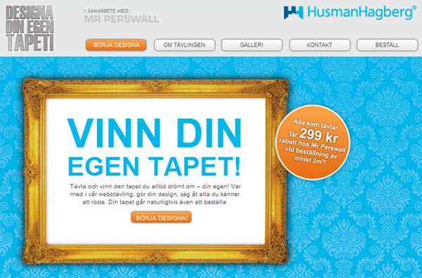 Men idag måste jag göra ett undantag. I veckan startades en tävling i samarbete med Mr Perswall, mäklarfirman HusmanHagberg och byrån Rekyl. En tävlingshemsida lanserades där man med enkla verktyg kan skapa sin egna drömtapet och även rösta på andras. Väldigt roligt verktyg som man lätt kan fastna en lång stund med. Det är definitivit tapetbranchens svar på Wordfeud, väldigt beroende framkallande, men lite inredningsgymnastik såhär på fredagen är väl aldrig fel?