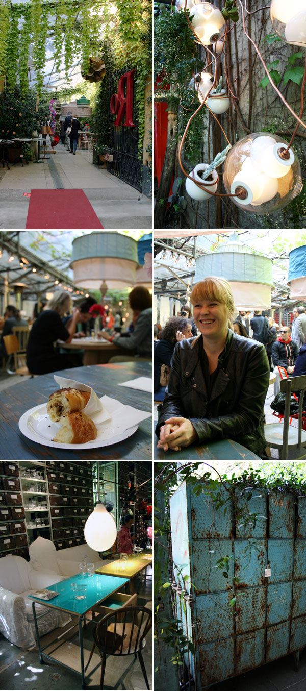 Idag var blev det även spanande och fika hos Rossana Orlandis studio/atelje/shop. Solen har tittat fram och det har varit fint vårväder. På Rossana Orlandis innegård känns det dock alltid mysigt och här vilade vi fötterna under de gigantiska lamporna. Vi mötte även Rossana herself när hon visade runt ett par besökare och hon hade (såklart) ett par stora glasögon, idag med blått glas. På kvällskvisten tog vi en drink på Bar Basso, nu hägrar sängen. Imorgon blir det upp tidigt och mot mässområdet. Spännande, spännande!