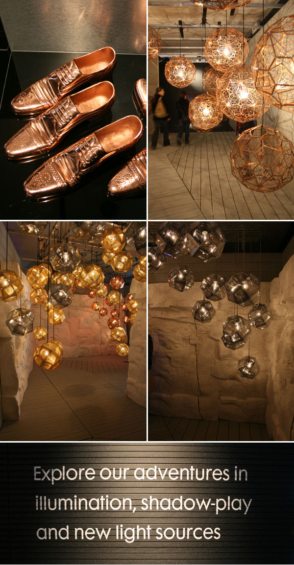 Tom Dixon lanserar nu kollektionen Eclectic med lite biligare saker som bland annat skorna här nedan som kan agera bokstöd. För mig är ändå varumärket lampor och deras utställning med mörka gångar med massor av dem var snyggt. De nya känns lite sköra och med dess geometriska mönster blir det väldigt fina skuggor. Jag gillar även metallfärger så jag och Dixon passar bra ihop!