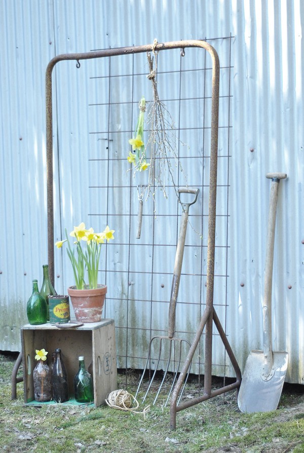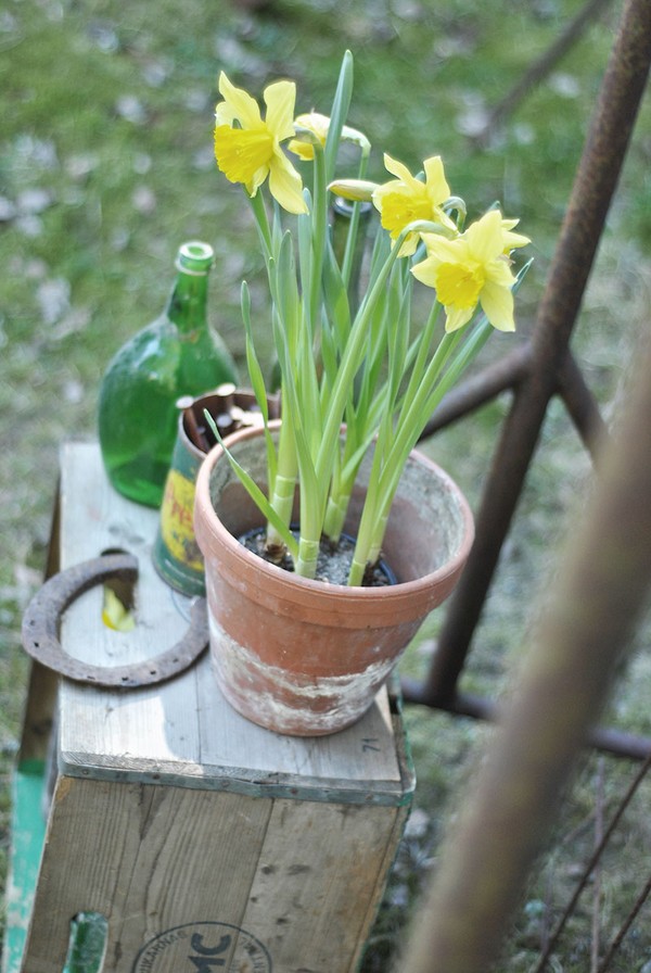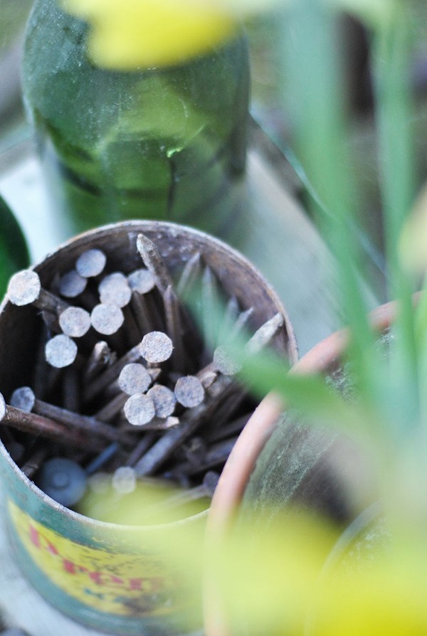 Till dessa foton plockade jag ihop ett gäng rostiga saker som stod ”på landet” (a.k.a hos mina föräldrar). Jag knipsade av några kvistar (vet ej vad) och hade med mig två krukor påskliljor och,