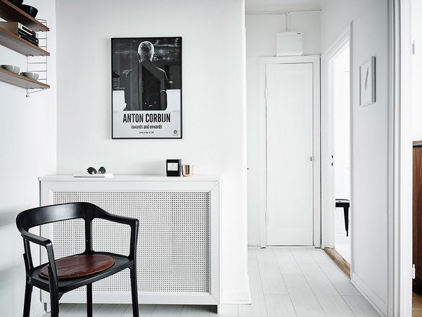 Ljus hall med återigen, snygg stol, stringhylla och jag gissar på ett inbyggt elementskydd som agerar liten hylla. Smart och snyggt. Vill du se alla bilder? Kika här.