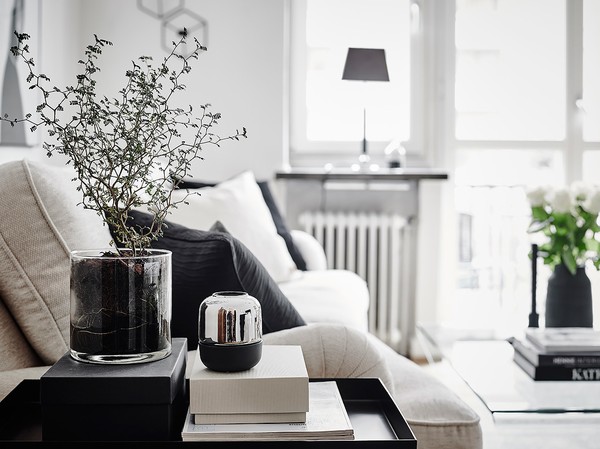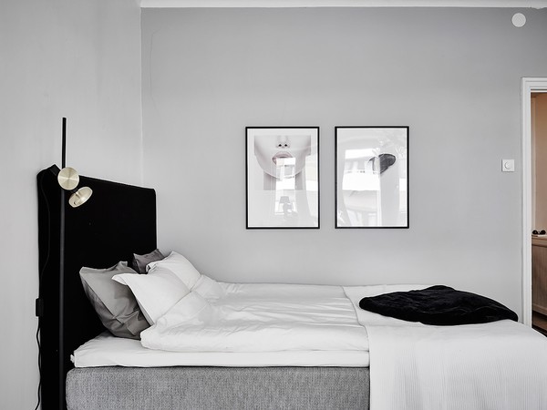 A one room apartment now for sale at Entrance Mäkleri in Gothenburg. I like the styling with the plexi glass table that makes the room feel larger and Ilike the side table for a little storage and still life. I also like the black head board for the bed. More pics? See them all here.