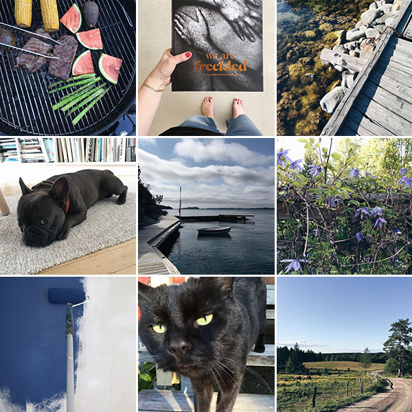 Vi är halvvägs in i juni och mina mobilbilder har semestervittring, här kommer ett utsnitt från det senaste! Grillen går varm och sist testades vattenmelon och avokado. Jag har jobbat med Marie på JM igen och bläddrat i We are Freckled och blivit förälskad i ”vår” brygga ett stenkast från nya hemmet på Ingarö. Jag har också varit med Lo och c/o och hunden Ralf i ett hus på Lidingö, vad som producerades där kommer snart mer om. Sen har det blivit en hel del promenerande i området på Ingarö och upptäcktsfärder i trädgården som just nu står i full blom. Bland annat har klematisen blommat så fint. Vi har också hängt en del inomhus med flytten och de blåa väggarna i sovrummet börjar ta form. Men nu har jag tagit en paus från målande och trädgårdfix och är istället hos föräldrarna och katten Ivar utanför Borås och jobbar ”hemifrån” här några dagar. Frilanslivet har sina stora fördelar!