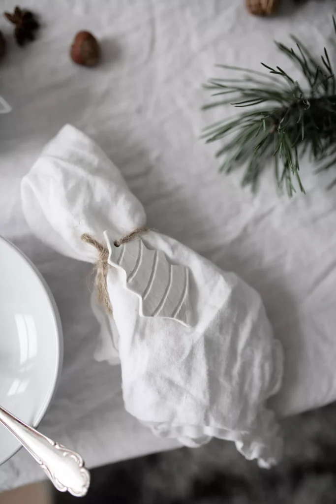 Samma till servetten, här har jag gjort en liten gran i vitlera med en pepparkaksform!