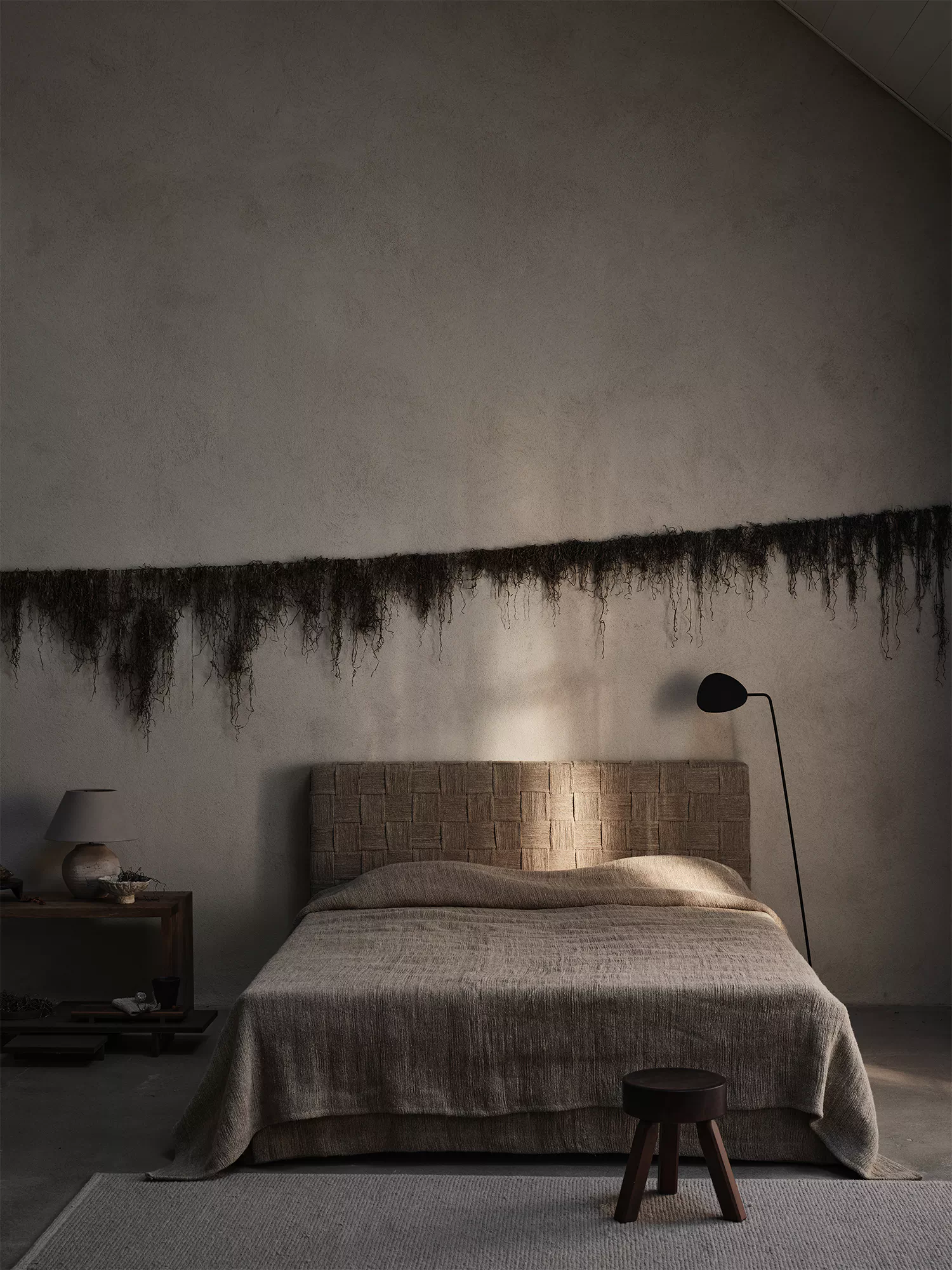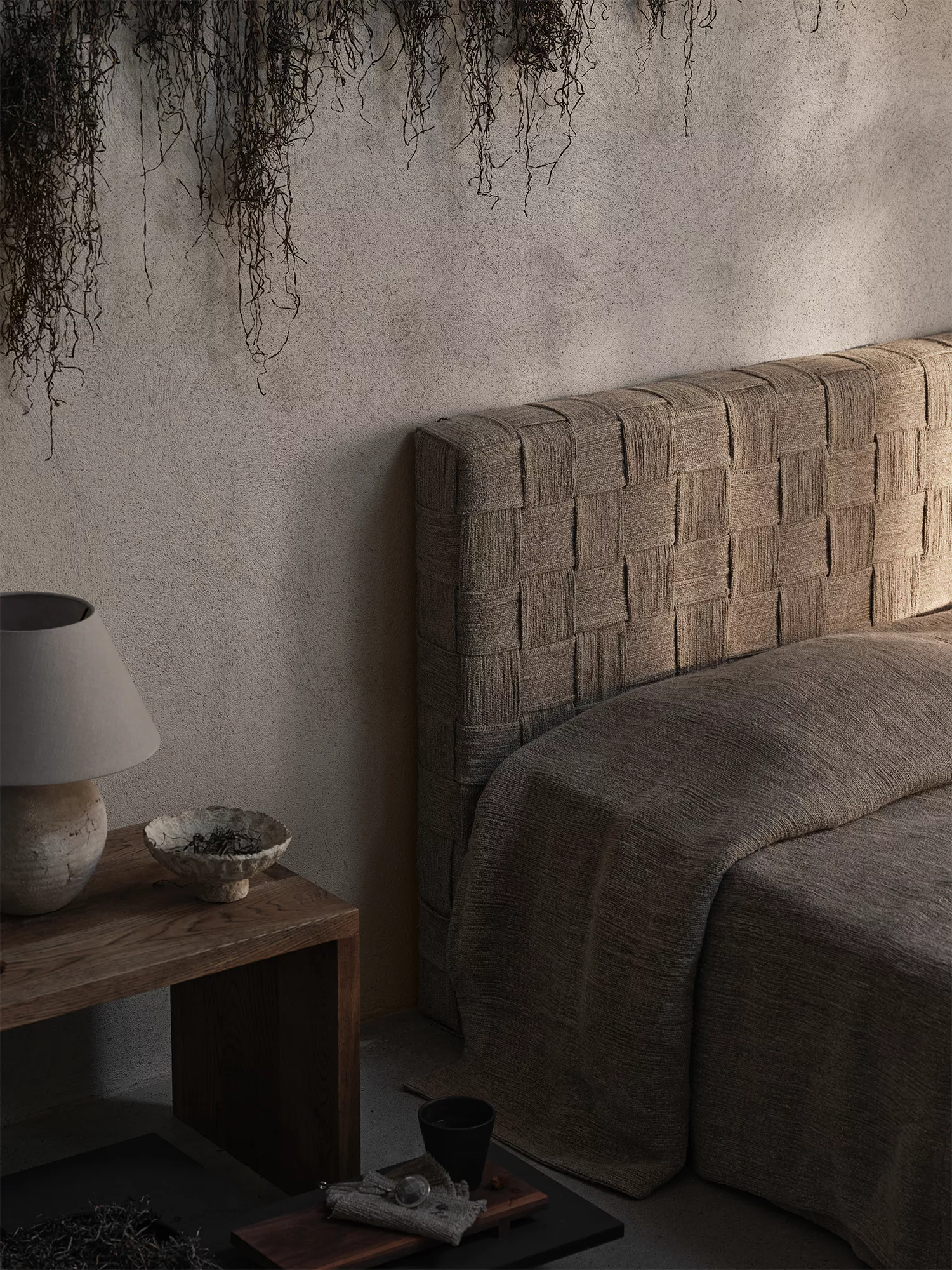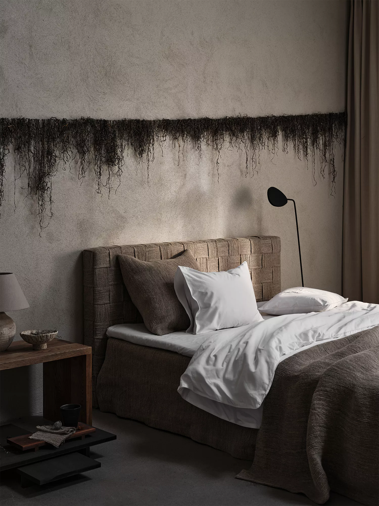 Sänggaveln har flätats av ett naturfärgat tyg från Astrid textiles och den tillverkas i Sverige. Den grova strukturen och tygets kulör kommer naturligt från hampan och linet det vävts av. Inspirationen kommer från Daniellas kärlek och respekt för hantverksskicklighet och naturmaterial.