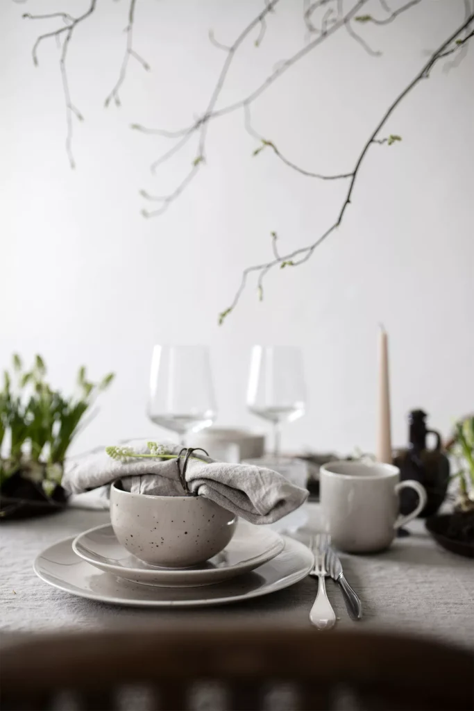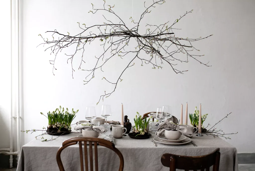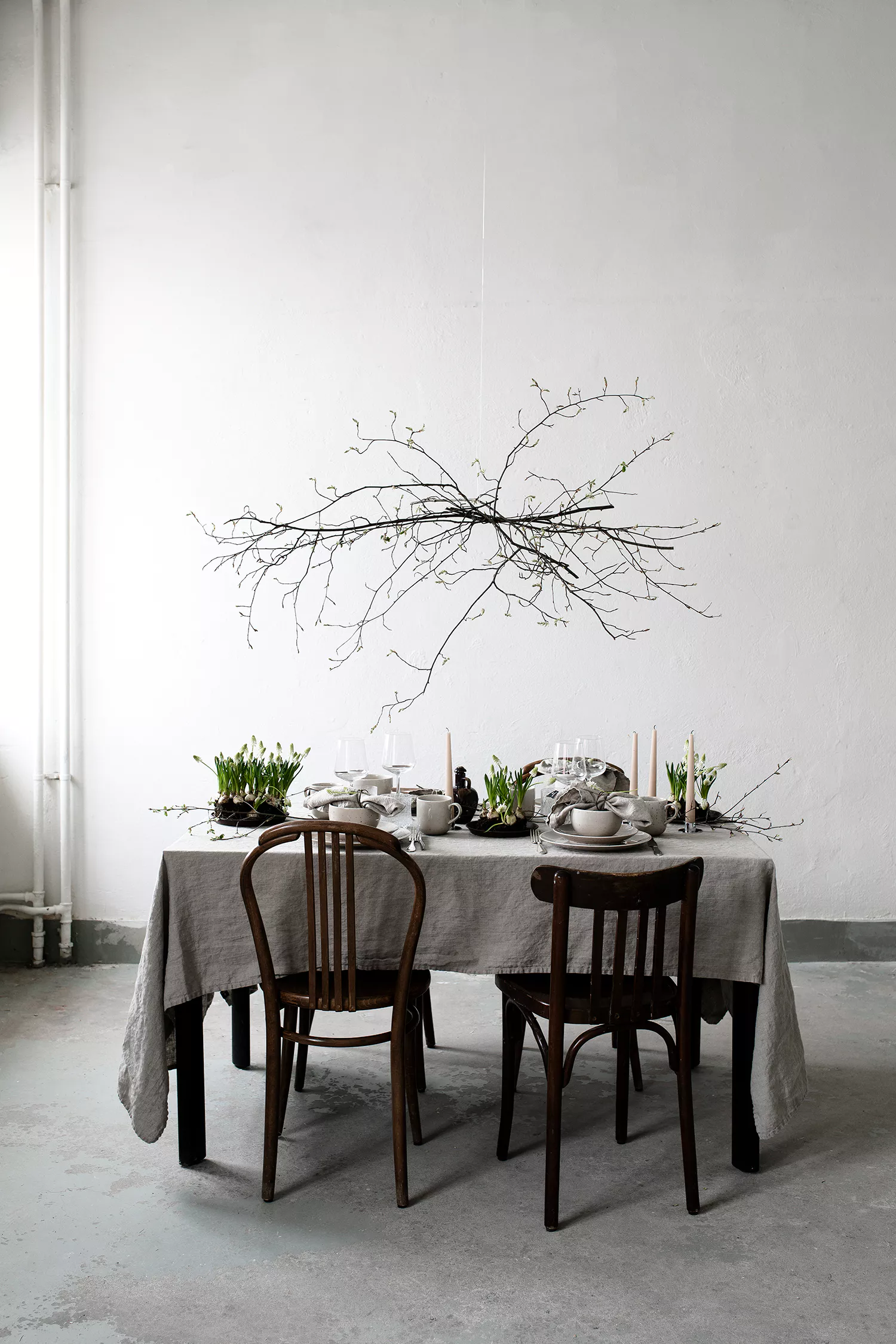 En dukning för fyra i ljusa toner. Att hänga upp kvistar som jag gjort här i fiskelina är både superenkelt och fint. Och stör inte sikten mot middagssällskapet mittemot.