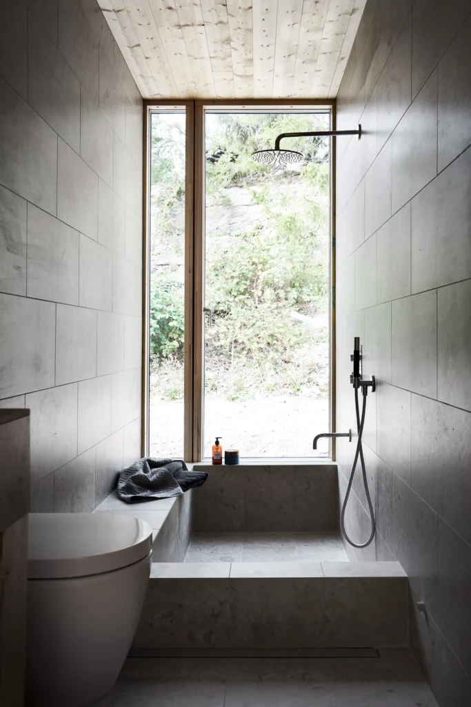 Ett badrum i någon form av kalksten? med ett trätak till. Fint. En dröm vore att ha ett stort fönster vid duschen och känna sig trygg med att grannarna är så långt borta så de ej ser in.. nästan som en utedusch!