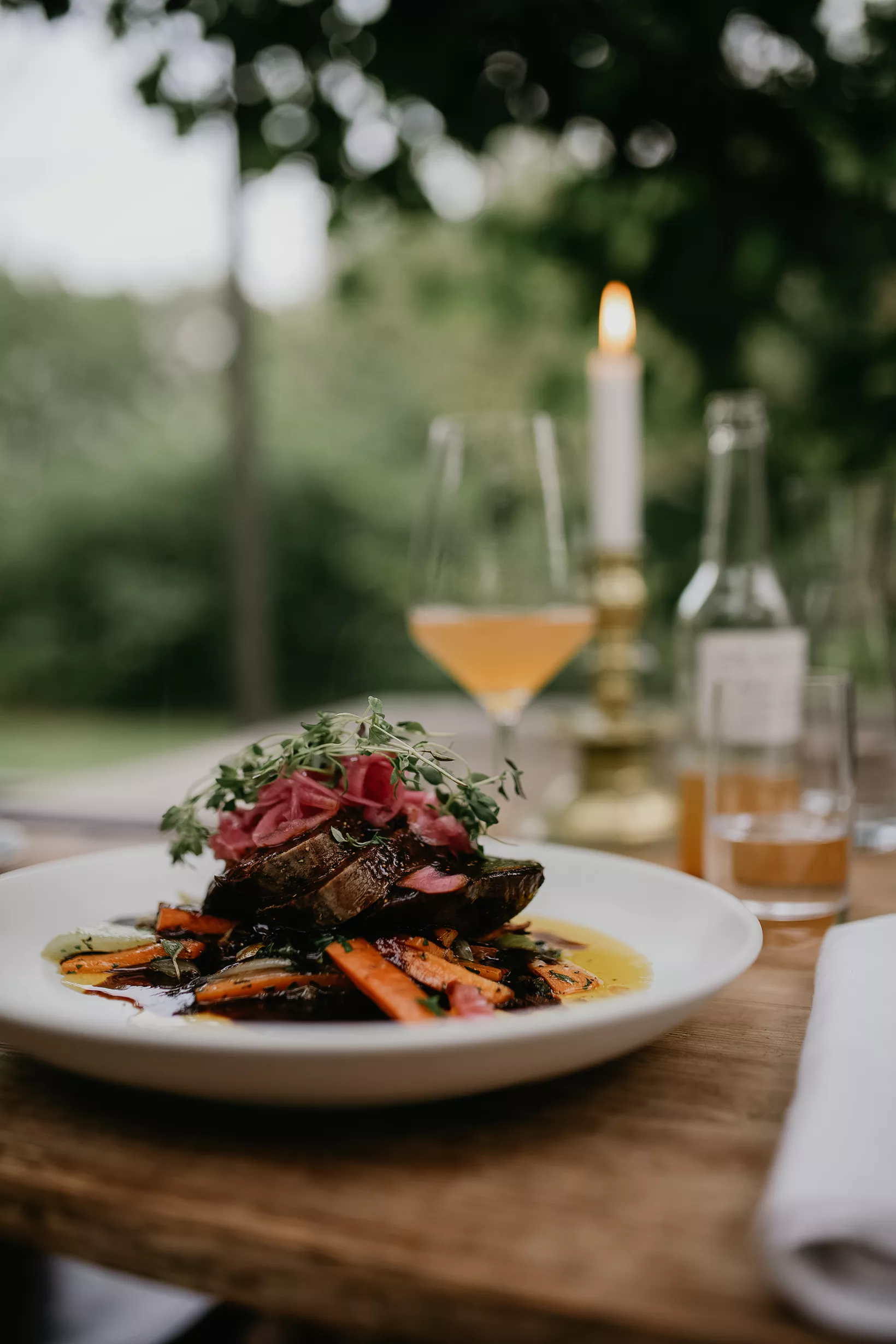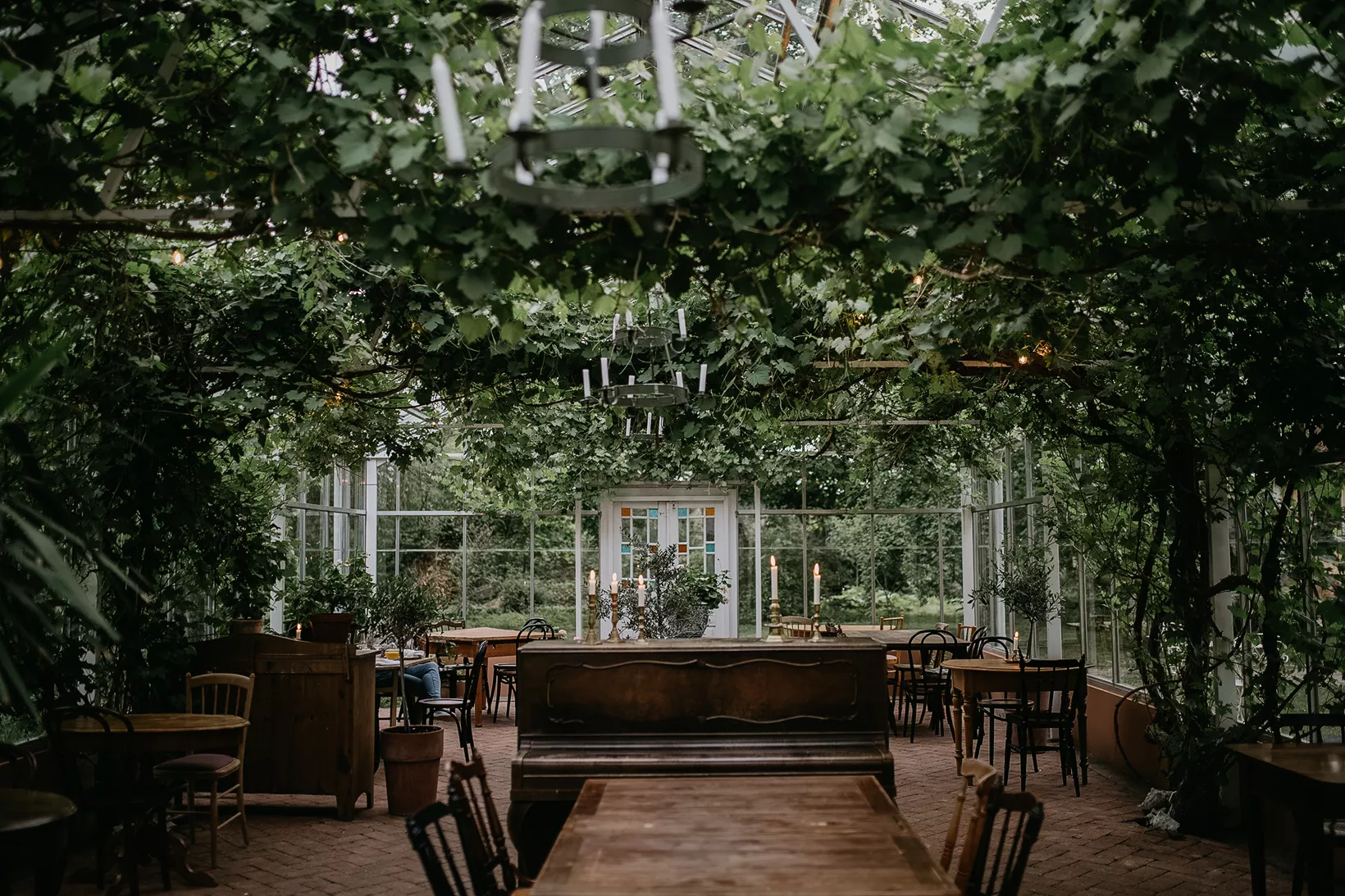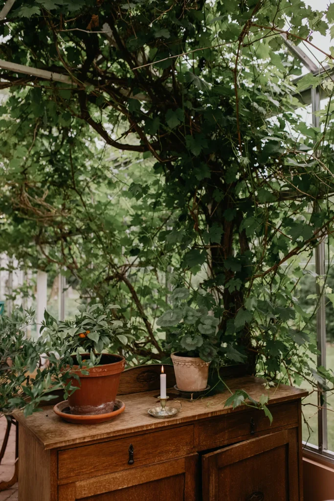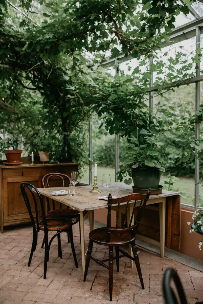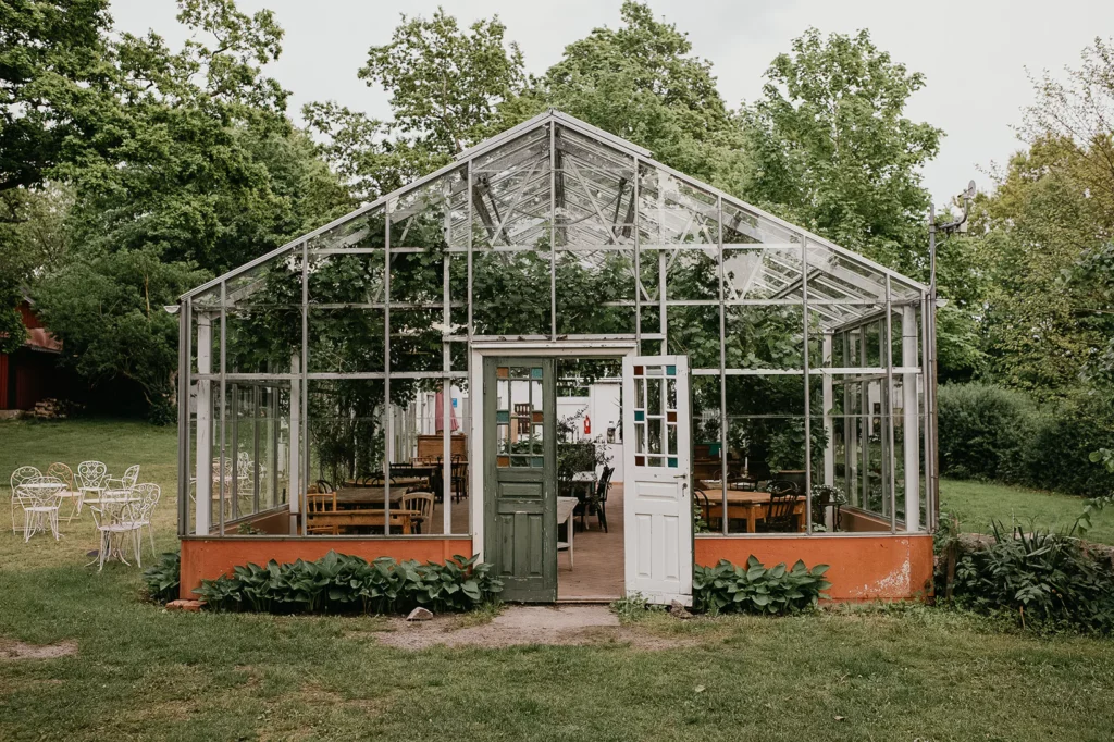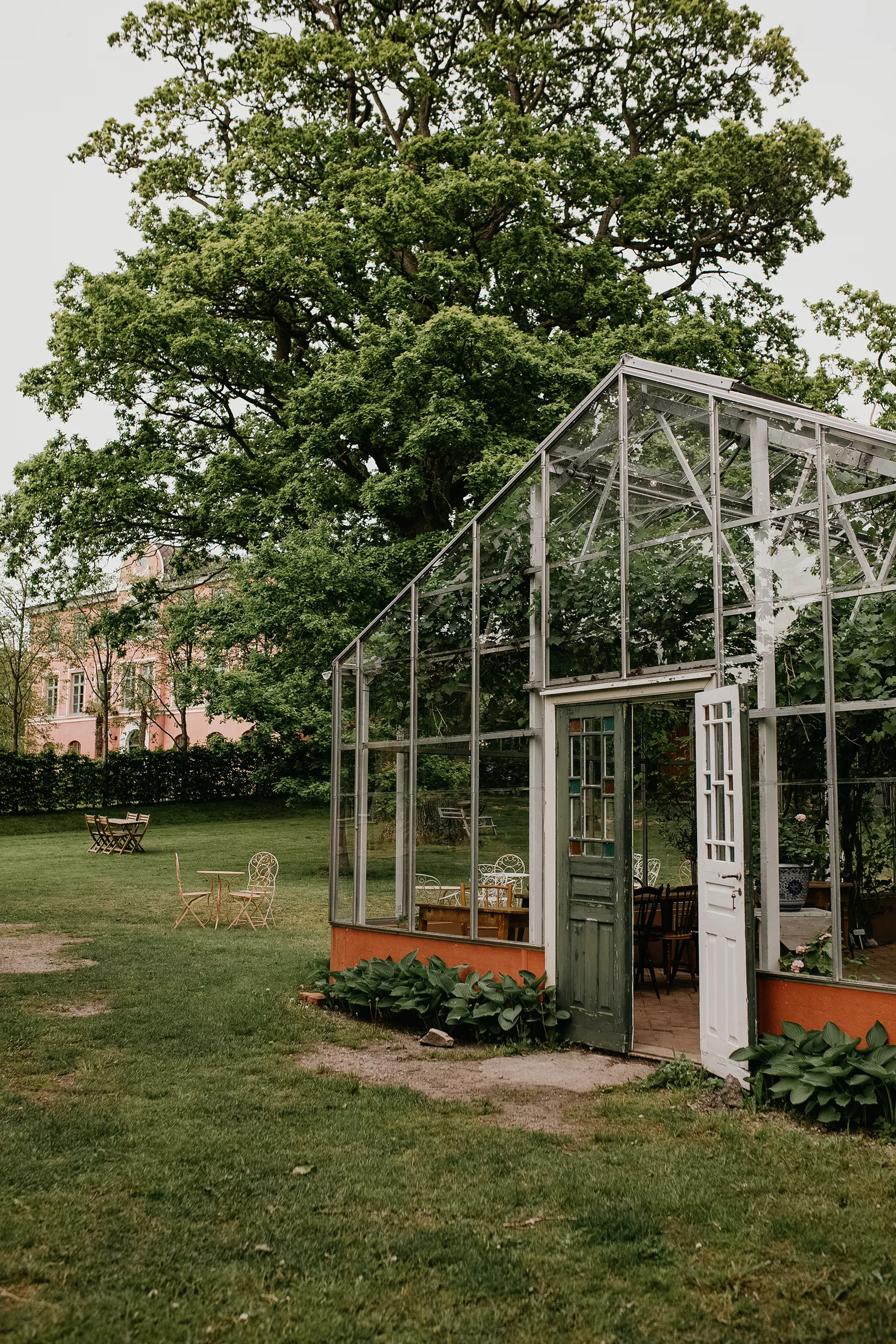 Den rosa herrgården ägs och drivs av paret Tove och Benjamin som köpte gården 2019. Sedan dess har de renoverat och inrett herrgården och dess flyglar och tagit sig an den stora trädgården och det magiska orangeriet. Se på bilden här nedan, alltså vilken plats att få äta en middag.