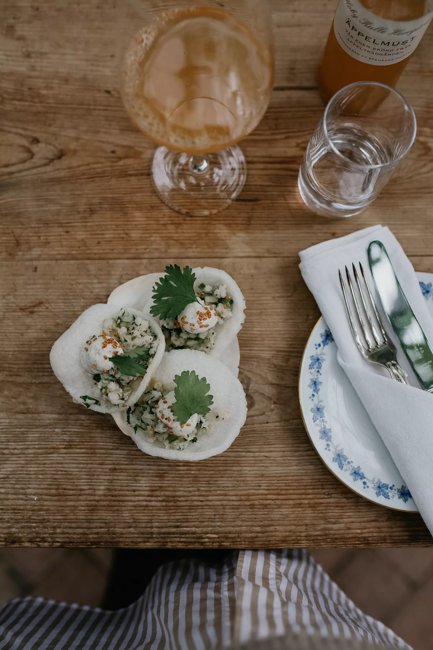 Vi var ensamma i orangeriet den kvällen och väldigt lyxigt så lagade Benjamin en magisk middag bara till oss två. Alltså på riktigt, den var verkligen super super god. Till förrätt räkor på krispiga chips och till maten drack jag deras Äppelmust från egen skörd.